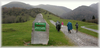 Si le ciel est noir à Samadet, c'est qu'il fait nuit. Il est 6h30. Nous ne sommes que six à partir marcher en montagne. Ces derniers jours la douceur du temps a dû faire fondre la neige tombée précédemment, et puis nous n'allons pas bien haut: à 1645 mètres au Soum de Quiala, un des premiers sommets dominant le piémont béarnais. A Pau il faut allumer les essuie-glaces... A l'entrée de la vallée d'Ossau on tourne à Castet, on grimpe en voiture au Port de Castet. C'est un hameau pastoral à 800 m. d'altitude dans une haute-vallée. Le crachin nous oblige à mettre vestes à capuches ou ponchos, mais rien de rédhibitoire...